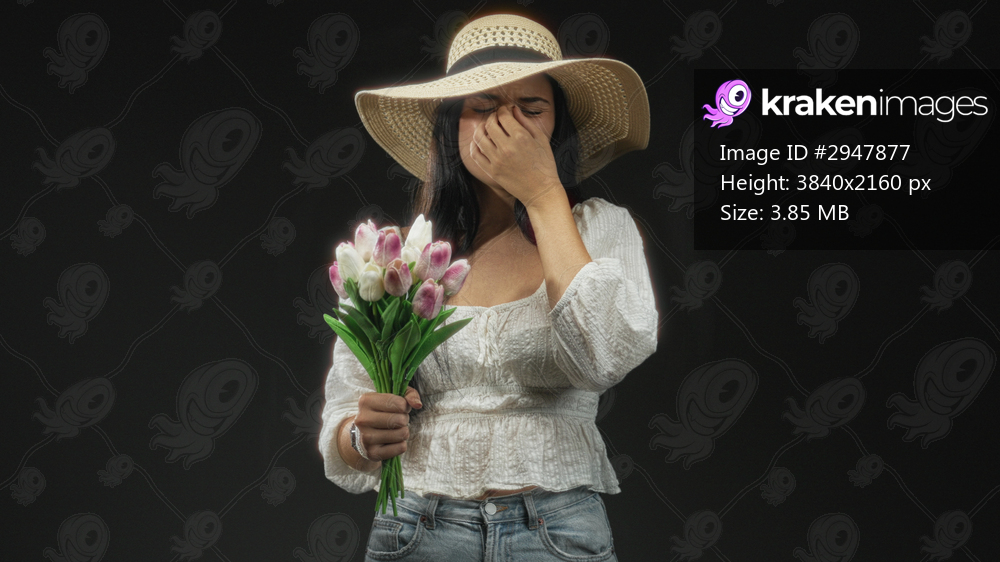 Woman holds bouquet and pinches nose in studio wearing straw hat and white blouse with jeans, tulips visible; disgust odor reaction.