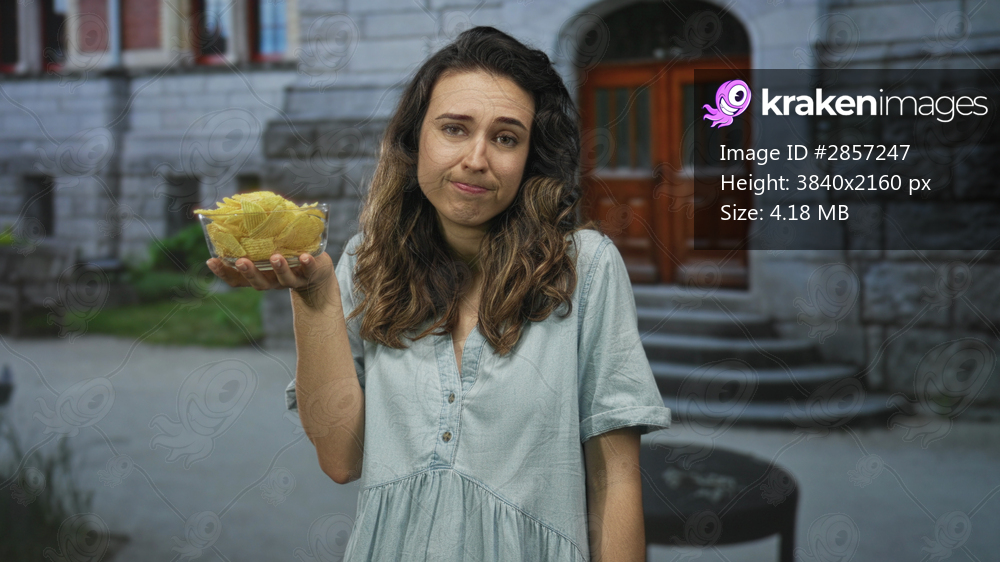 Woman holds bowl of chips with outstretched hand and unimpressed gaze in front of a stone building; snacking boredom.