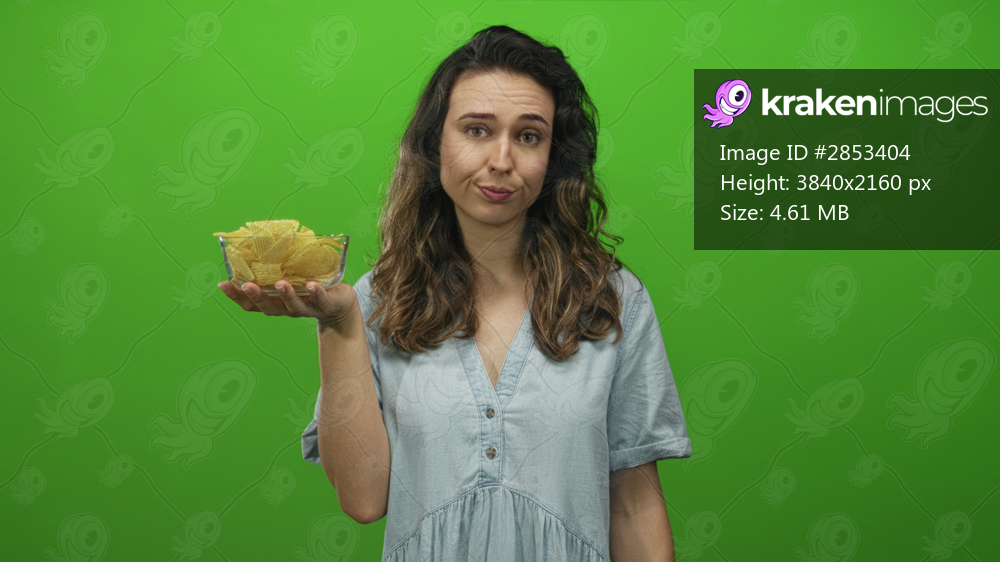 Woman holds bowl of crispy ridged potato chips with palm raised and frowns at camera in green studio; skepticism.