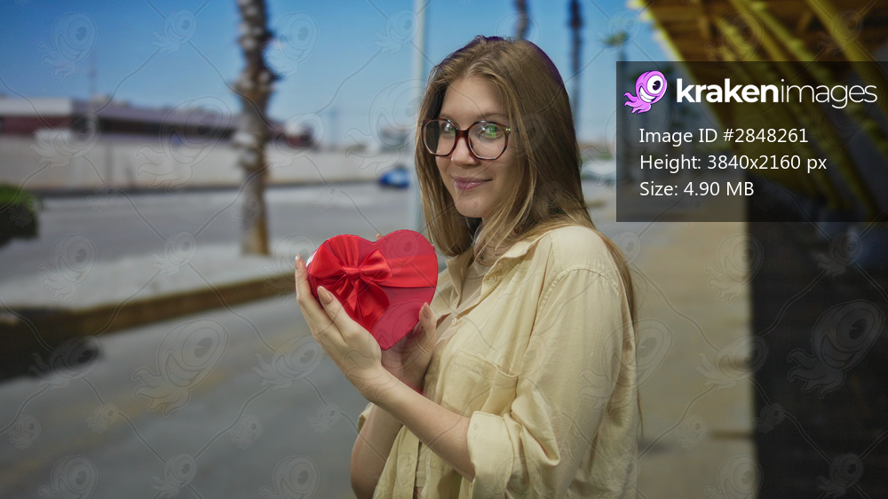 Woman holds bright red gift box with both hands on sunny city street beside yellow scaffolding and palm trees; celebration joy.