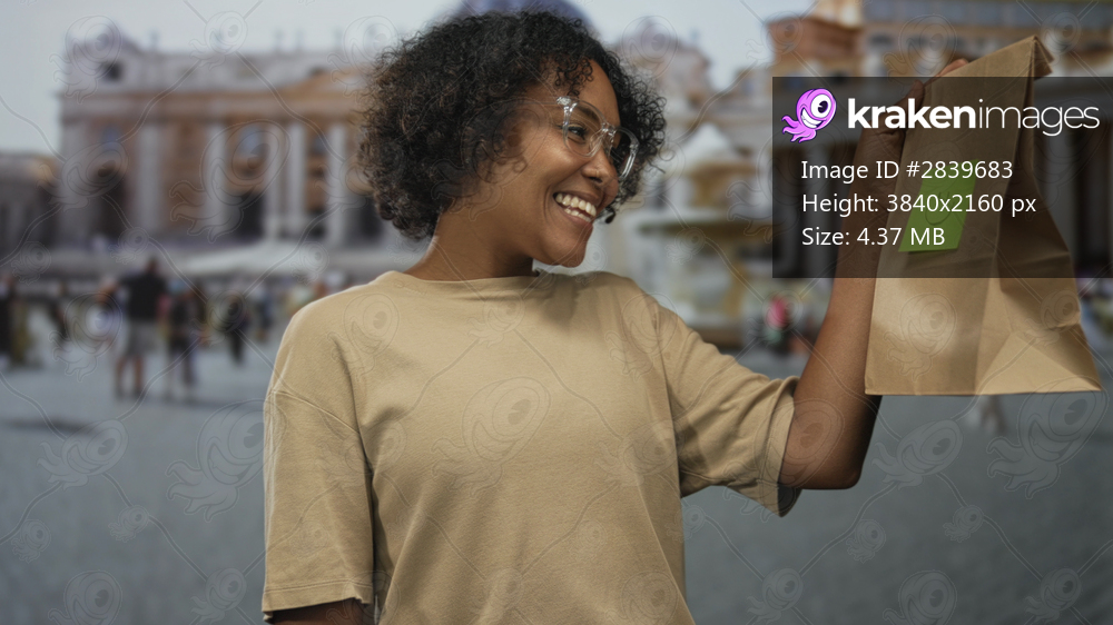 Woman holds brown paper bag with smiley sticky note while wearing glasses and beige shirt in vatican square; joy.