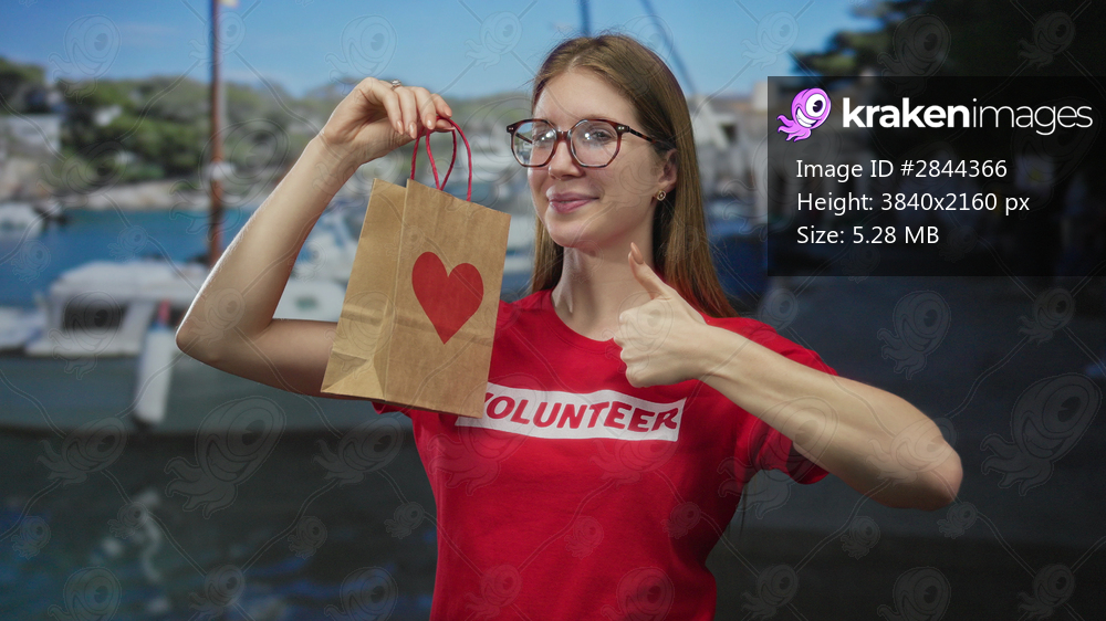 Woman holds brown paper bag stamped with red heart and gives thumbs up at street beside moored boats and white building; compassion.