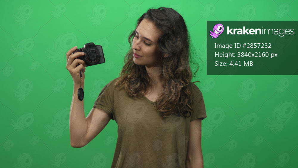 Woman holds camera against green screen in studio while pointing at lens and smiling; joy creativity.