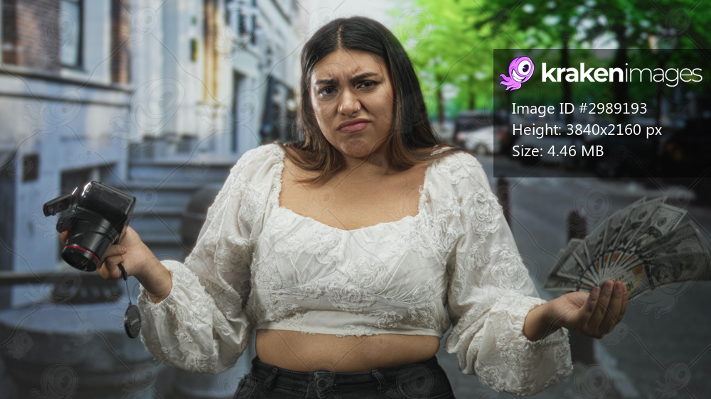 Woman holds camera in one hand and fans cash with the other on a street lined with parked cars and trees; frustration money dilemma.