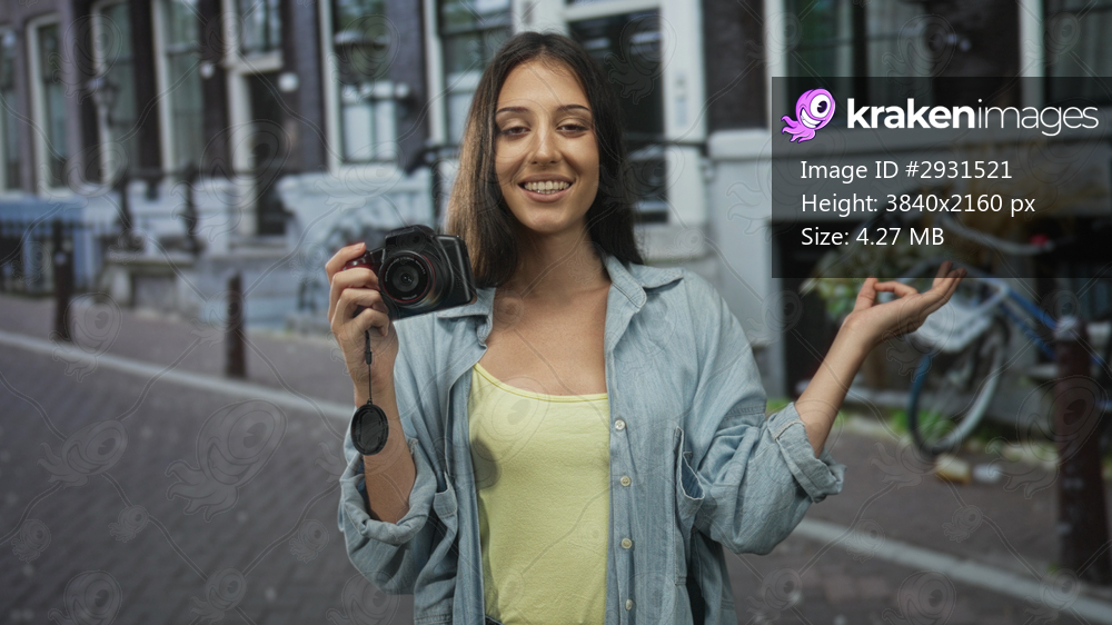 Woman holds camera near chest and makes ok sign with right hand on street lined with buildings and parked bicycle; travel joy.