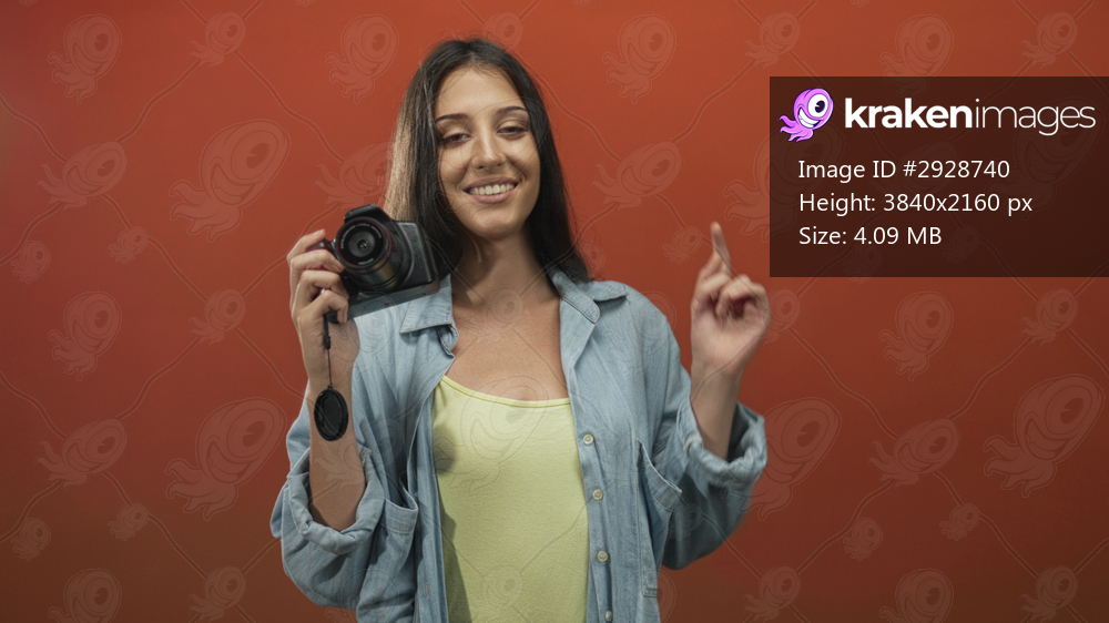Woman holds camera up while smiling and pointing with right hand in red studio wearing denim shirt and yellow tank top; joy creativity.