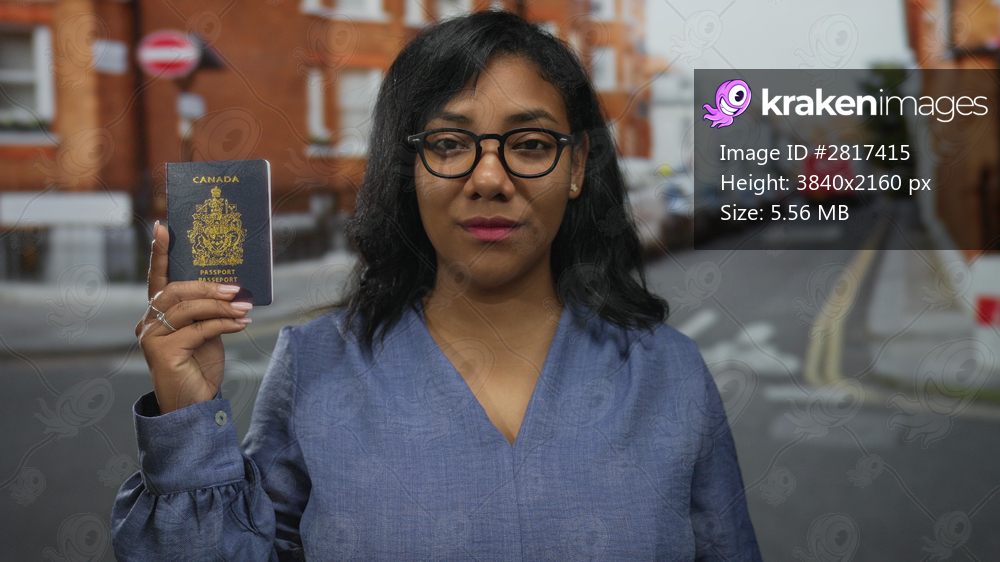 Woman holds canadian passport in raised hand on an urban street while wearing glasses and blue blouse; identity diversity empowerment pride.