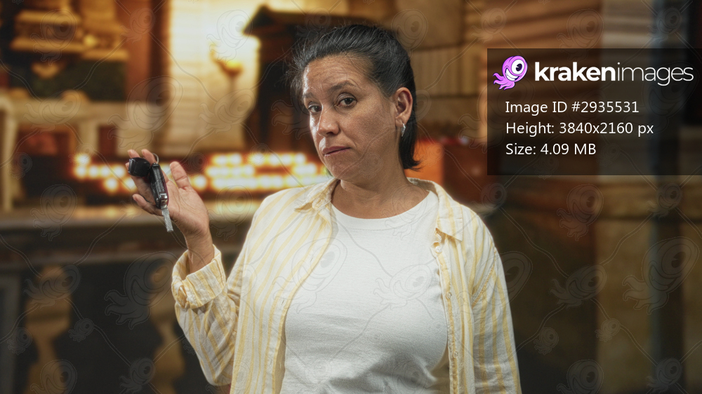 Woman holds car key fob and raises hand in a dismissive shrug with pursed lips inside a building; resignation routine practicality.