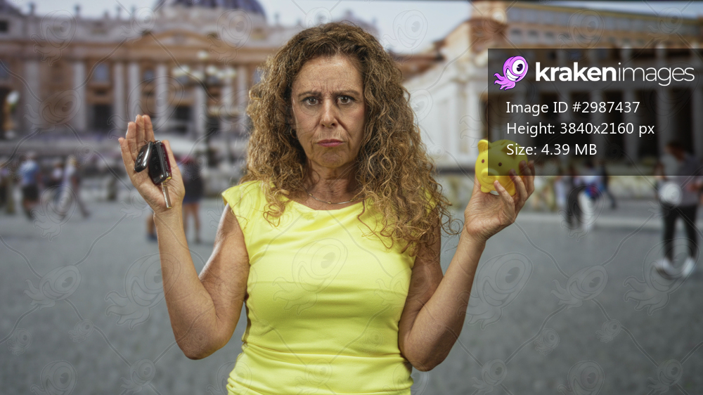 Woman holds car keys in right hand and yellow piggy bank in left hand before a building, furrowed brow expression; financial worry.