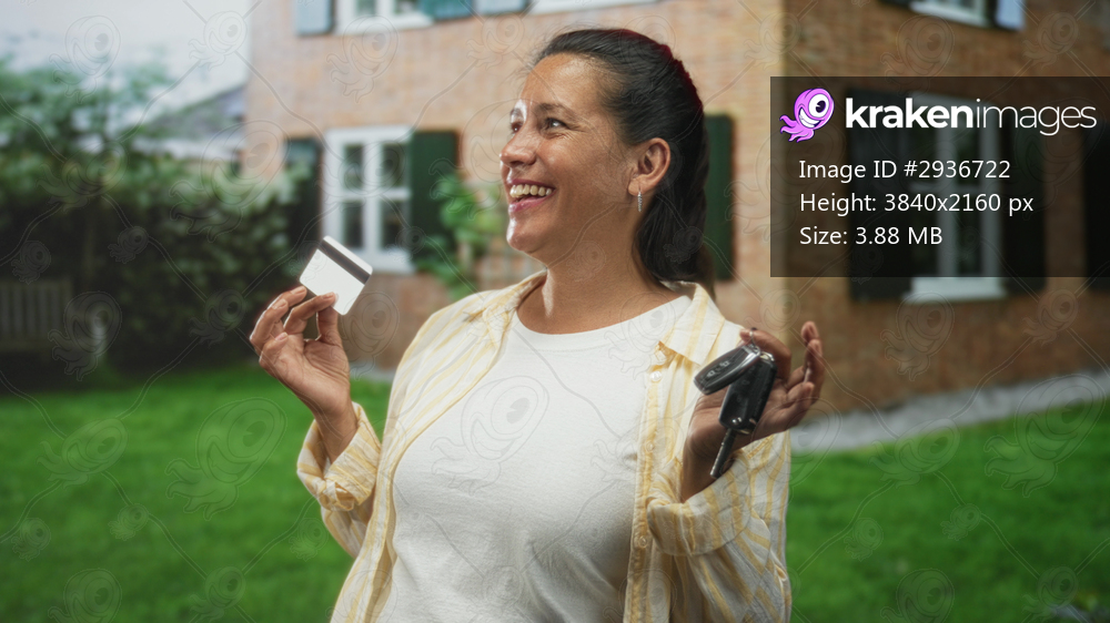 Woman holds car keys and payment card in right hand while smiling and slightly raising shoulder outside a brick building on a lawn; new car joy.