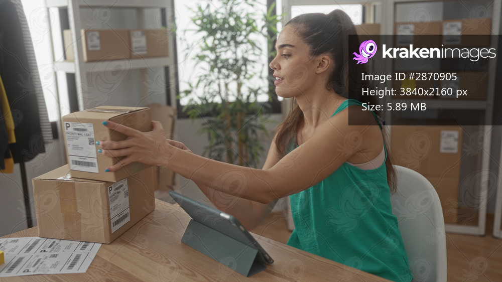 Woman holds cardboard package and checks shipping label at office building desk with stacked parcels and tablet; productivity organization.