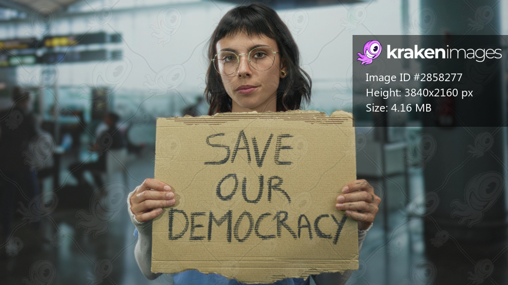 Woman holds cardboard protest sign reading save our democracy in busy airport terminal; activism solidarity.