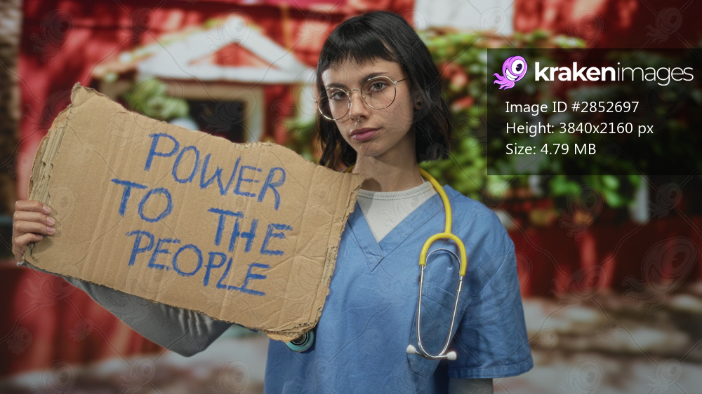 Woman holds cardboard sign with hand at building entrance while looking at text; empowerment determination.