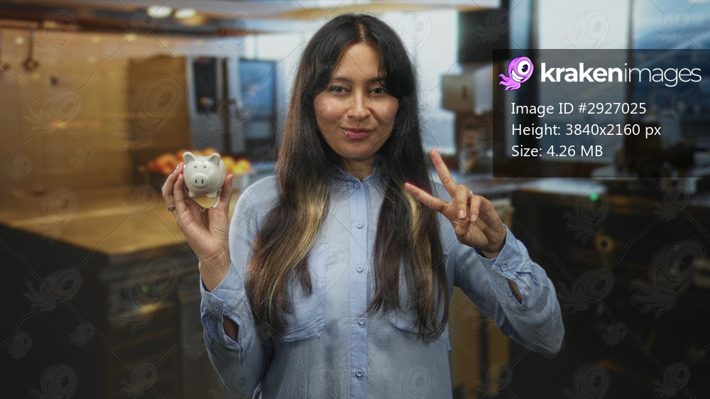 Woman holds ceramic piggybank in left hand and makes peace sign with right hand in kitchen building; hopeful personal savings.