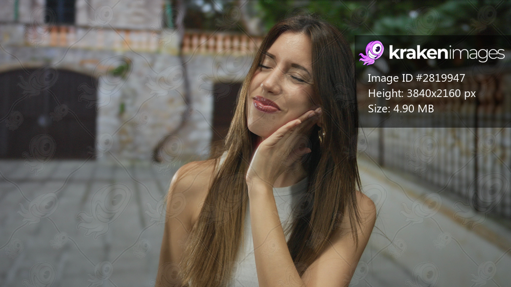 Woman holds cheek with hand, closes eyes in front of stone building on street in daylight; reflection.