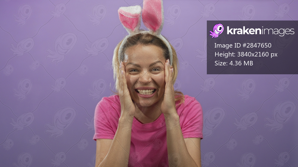 Woman holds cheeks with both hands in a purple studio setting wearing bunny ears and pink shirt; surprise.