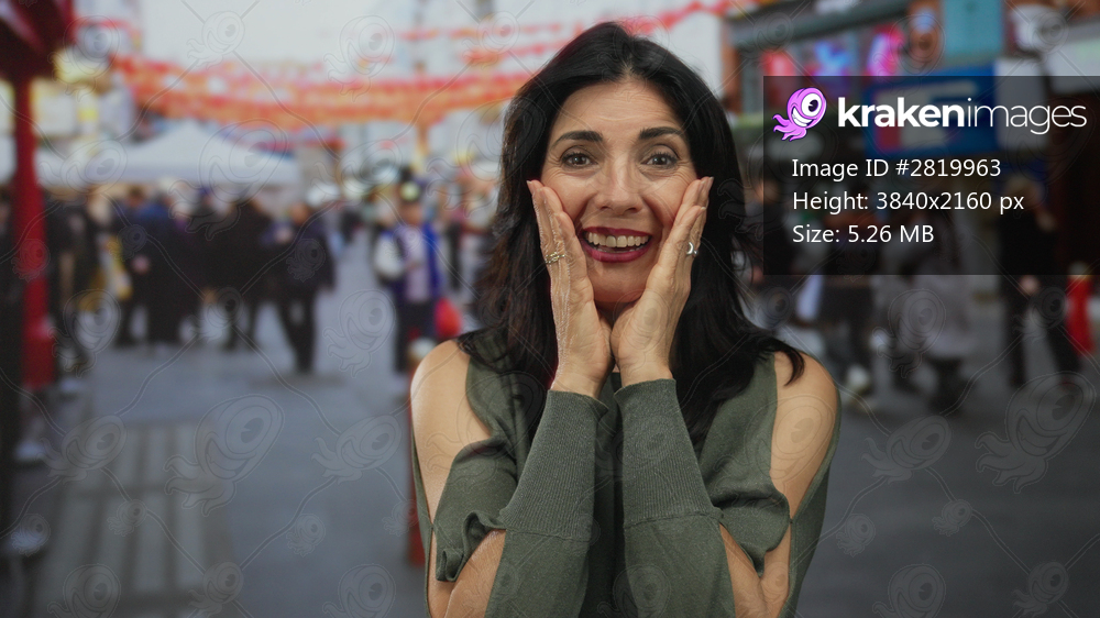 Woman holds cheeks with both hands on a bustling colorful city street under hanging lanterns; surprise.