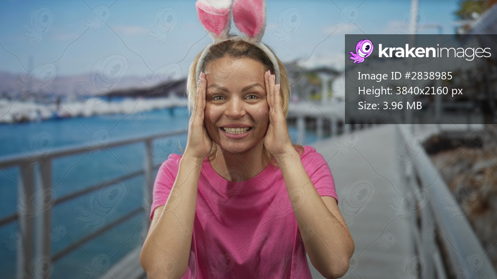 Woman holds cheeks with both hands on a sunny wooden street pier by sea, wearing pink bunny ears and vibrant shirt, smiling broadly at camera; joy.