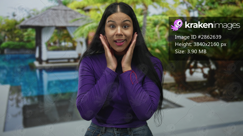 Woman holds cheeks with hands at hotel pool beside resort building outdoors under sunlight; surprise.