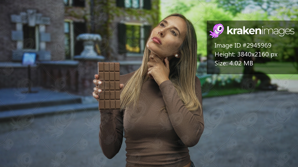 Woman holds chocolate bar in one hand and presses finger to throat while standing by a historic building entrance; temptation craving decision.
