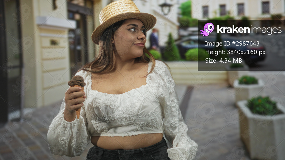 Woman holds chocolate ice cream cone in right hand, bare midriff and straw hat visible, glancing sideways while standing on cobbled street; curiosity leisure. - Kraken Images