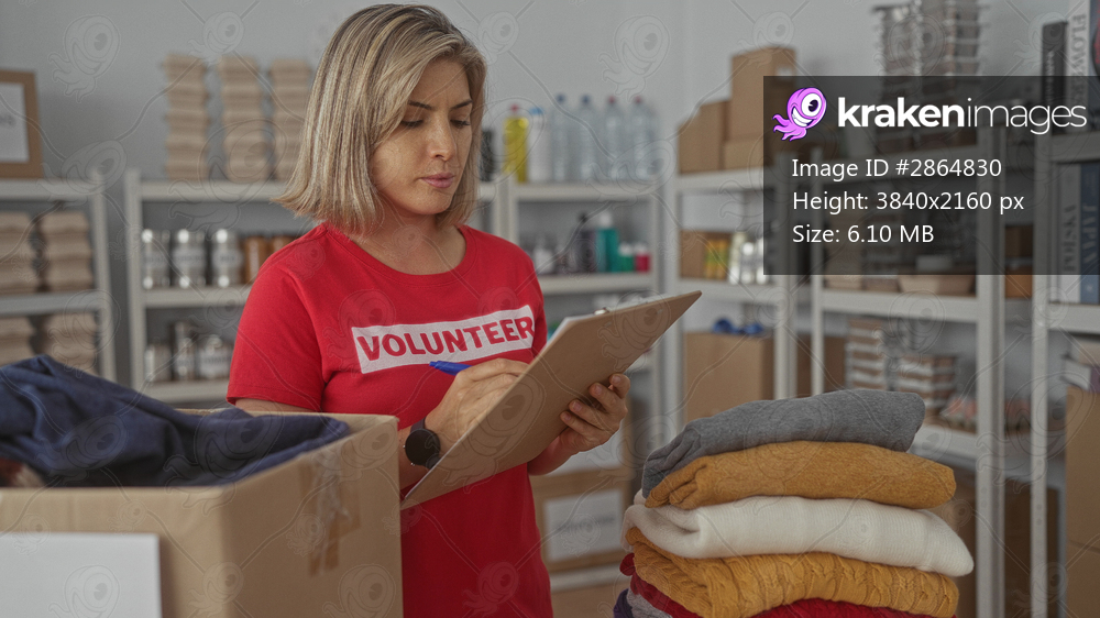Woman holds clipboard and pen over a stack of donated clothes next to a donations box inside building; compassion.