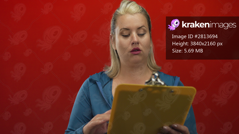 Woman holds clipboard and pen while reading notes and gesturing with hand in studio; concentration analysis.