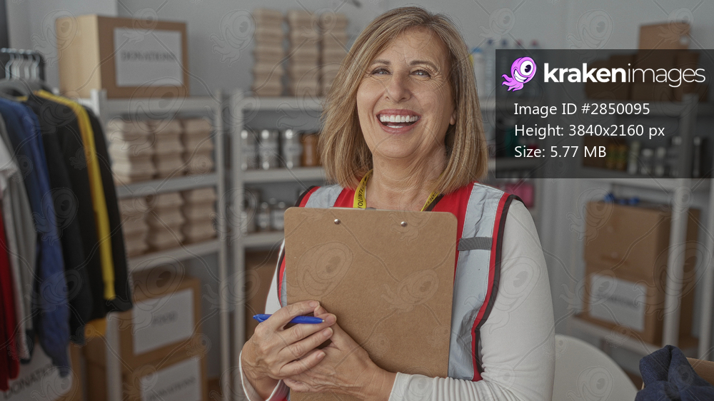 Woman holds clipboard and smiles at donation center shelves filled with clothes and cans; compassion service.