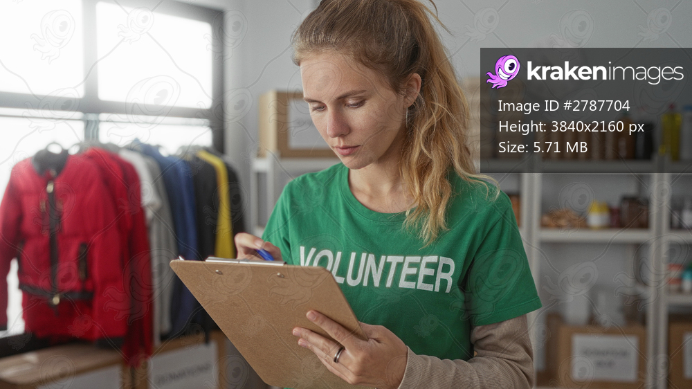 Woman holds clipboard while writing inventory in warehouse alongside blonde young volunteer using pen near donation boxes.
