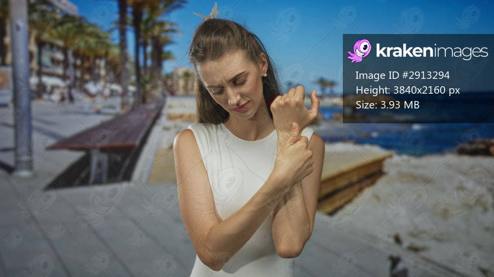 Woman holds and clutches wrist, grimacing and pointing to sore skin on a street promenade boardwalk by the seaside; pain recovery concern.