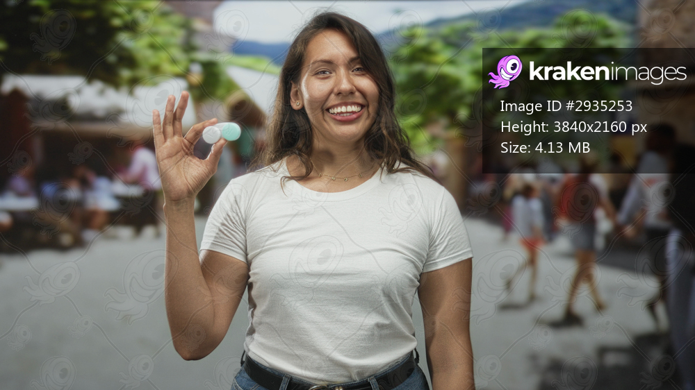 Woman holds contact lens case between fingers on a bustling city street market; self care joy wellness.