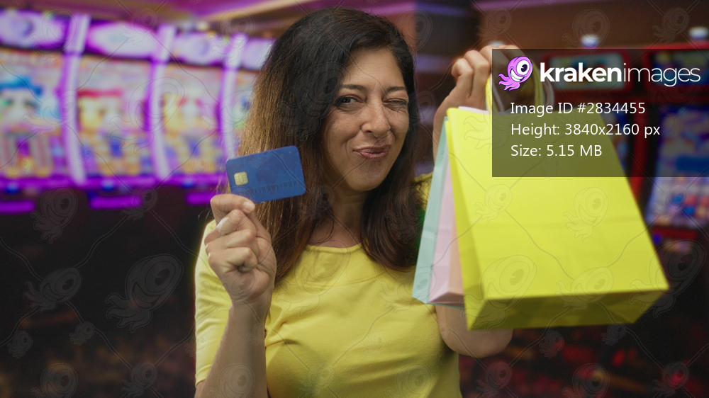 Woman holds creditcard and colorful shopping bag by slot machines inside a casino building; anticipation.