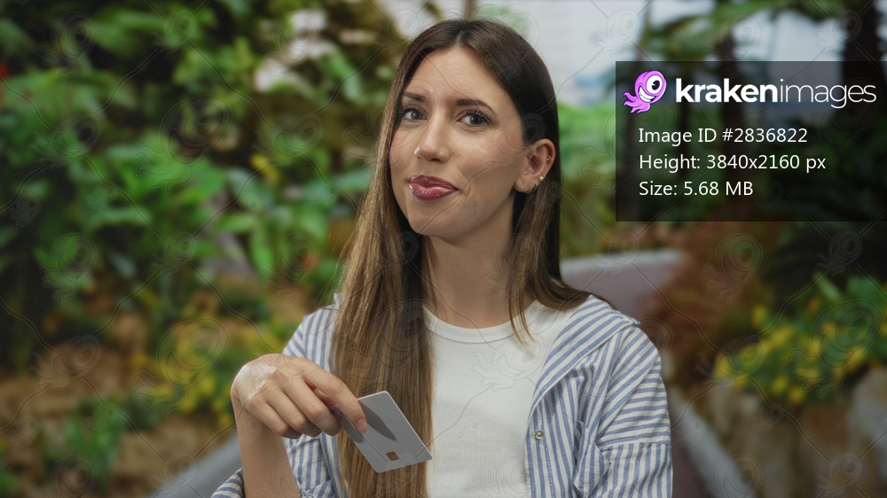 Woman holds creditcard with outstretched hand at forest clearing under vibrant green foliage; aspiration.