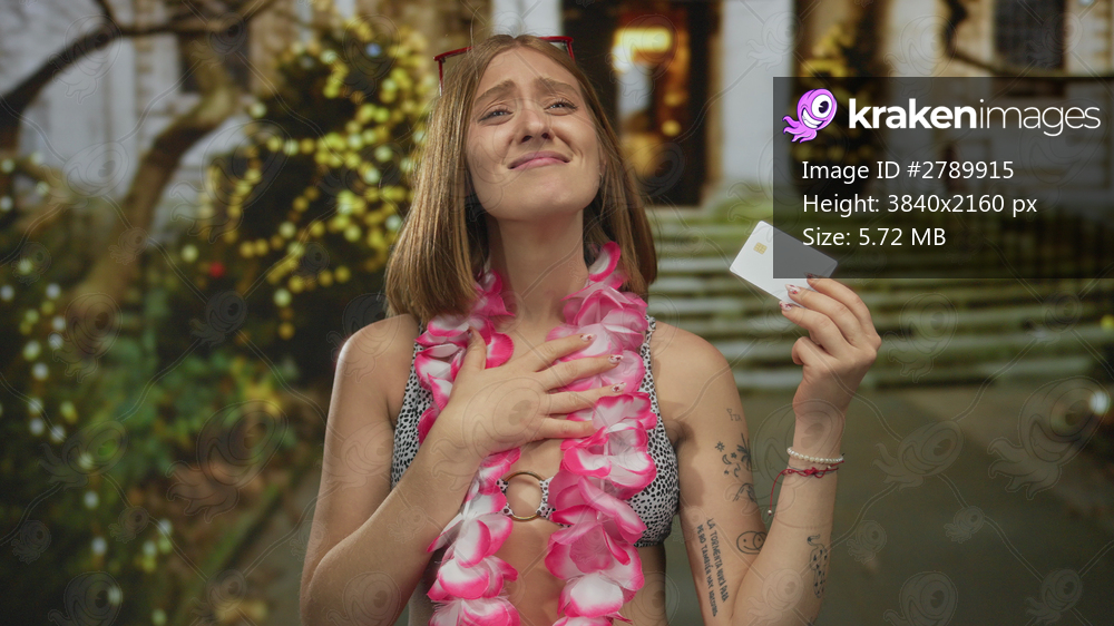 Woman holds creditcard and places hand on chest on city street at night; debt anxiety frustration despair.
