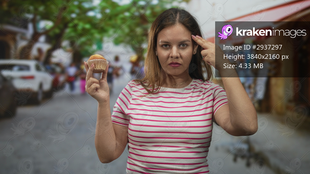 Woman holds cupcake between fingers and finger to temple on a street with shops and parked cars; indecision.