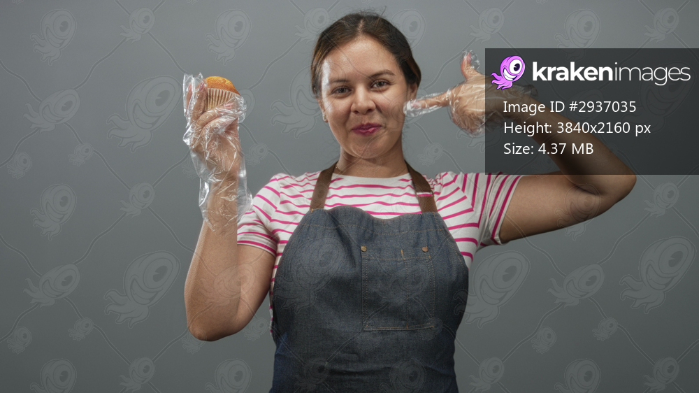 Woman holds cupcake in a clear glove and points finger to cheek while smiling in a gray studio wearing an apron; baking hygiene cheerful.