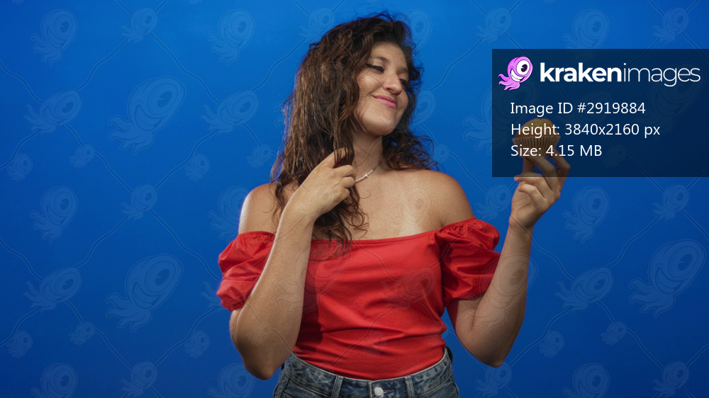Woman holds cupcake in one hand and touches hair revealing bare shoulder in studio; playful confidence blue.