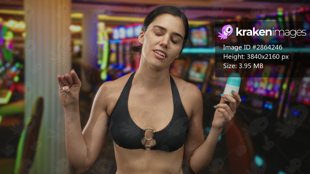 Woman holds deodorant stick near nose making grimace gesture in vibrant casino slot machine interior; disgust.