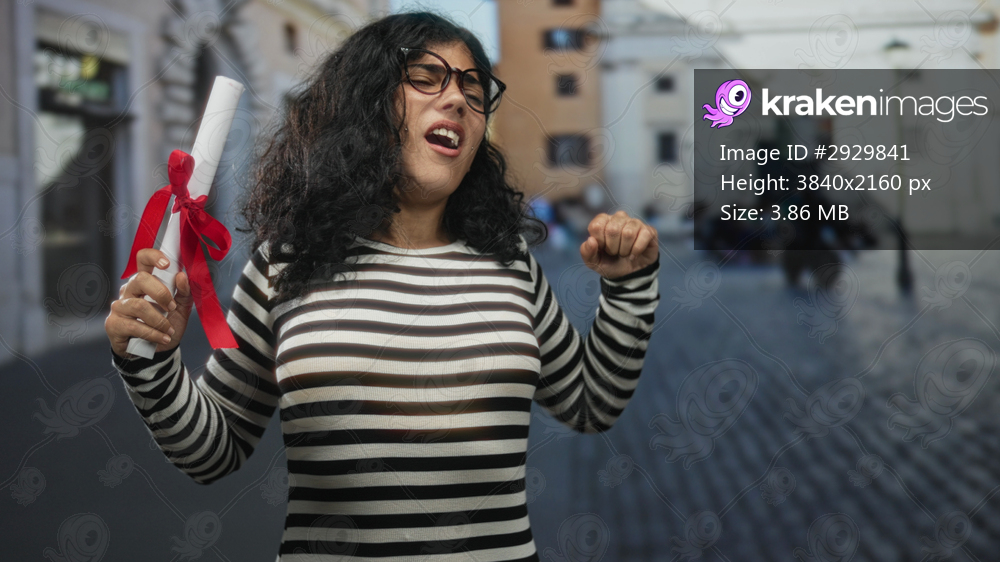 Woman holds diploma with red ribbon while singing and raising a fist on a cobbled street in the city; joy celebration achievement.