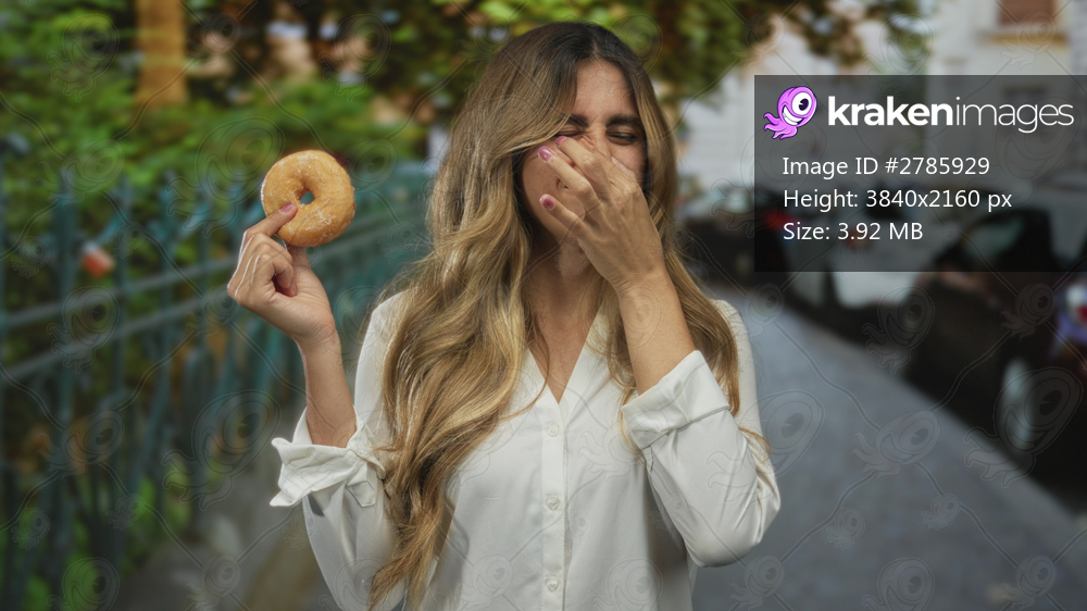 Woman holds donut with one hand and pinches nose with other hand in city street; disgust nausea rejection aversion.