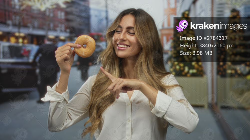 Woman holds donut and points finger to pastry in urban street market; holiday cheer enjoyment temptation.