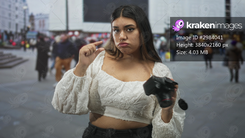 Woman holds dslr camera and pinches fingers in a small gesture while pouting, showing the camera to passersby on a busy street; playful annoyance.