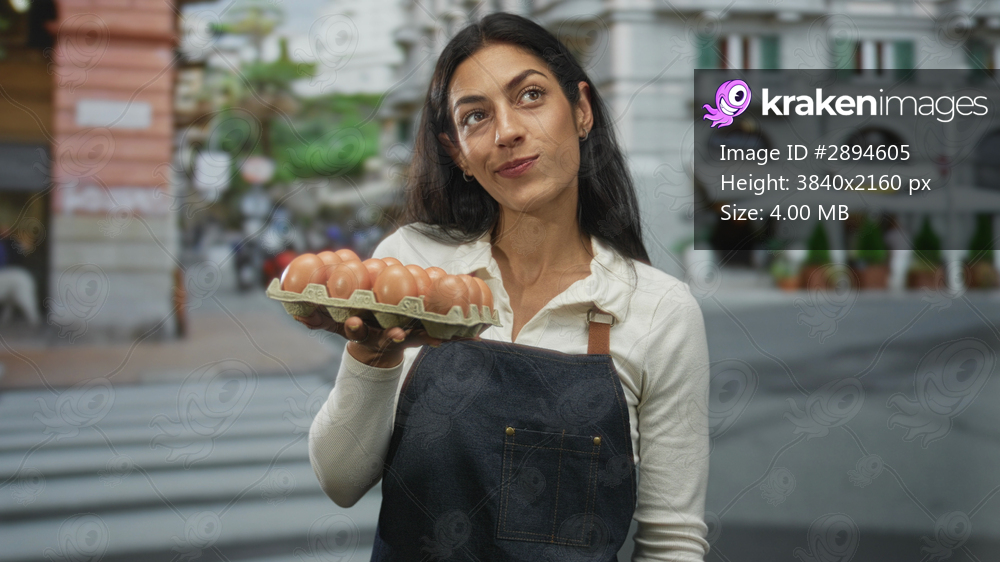 Woman holds egg carton of brown eggs with one hand at chest level, wearing denim apron and smiling in front of a street cafe; local market pride.