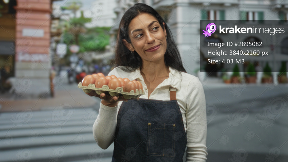 Woman holds egg carton of brown eggs with one hand at chest level, wearing denim apron and smiling in front of a street cafe; local market pride.