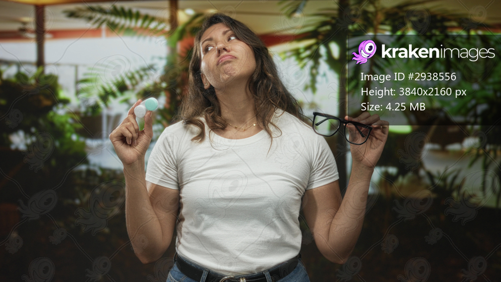 Woman holds eyeglasses and contact case in hands inside a building with potted plants and large windows; indecision choice dilemma.