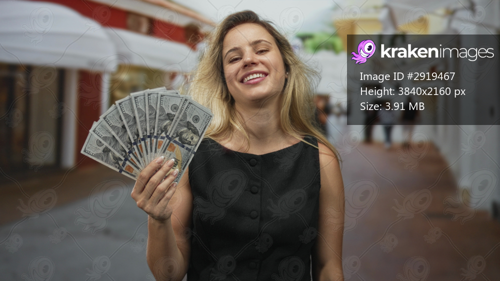 Woman holds fan of cash with hand and fingers visible in a street storefront scene; wealth joy celebration.