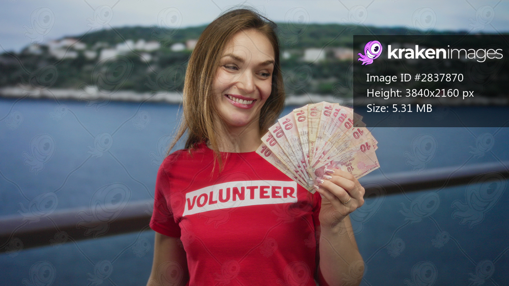 Woman holds fan of turkish lira banknotes with bare hand at seaside promenade; charity donation optimism.