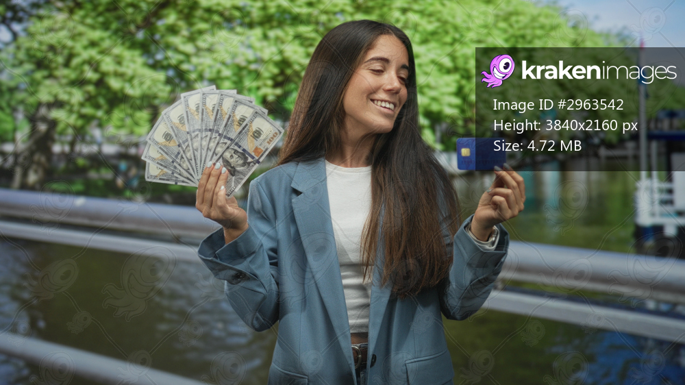 Woman holds fan of us dollars and shows a creditcard with both hands, smiling on street by a canal railing; financial confidence.