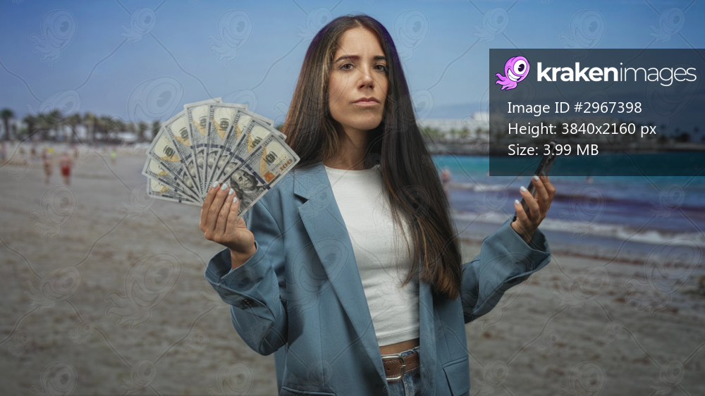 Woman holds fanned hundred dollar banknotes in one hand and a smartphone in the other, stern expression while displaying cash in a studio; wealth confidence. - Kraken Images