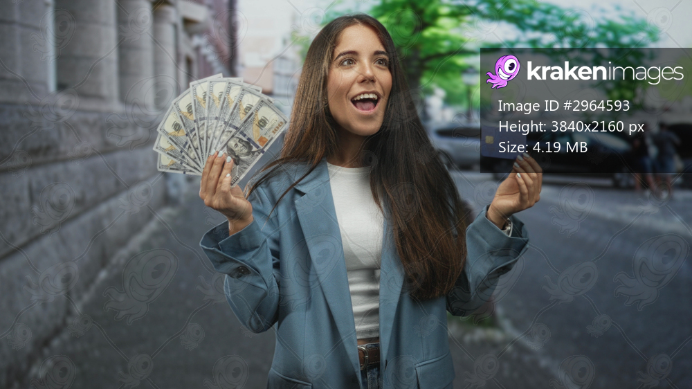 Woman holds fanned us dollars and a creditcard, mouth open and hand raised in a celebratory gesture on a city street; financial excitement.